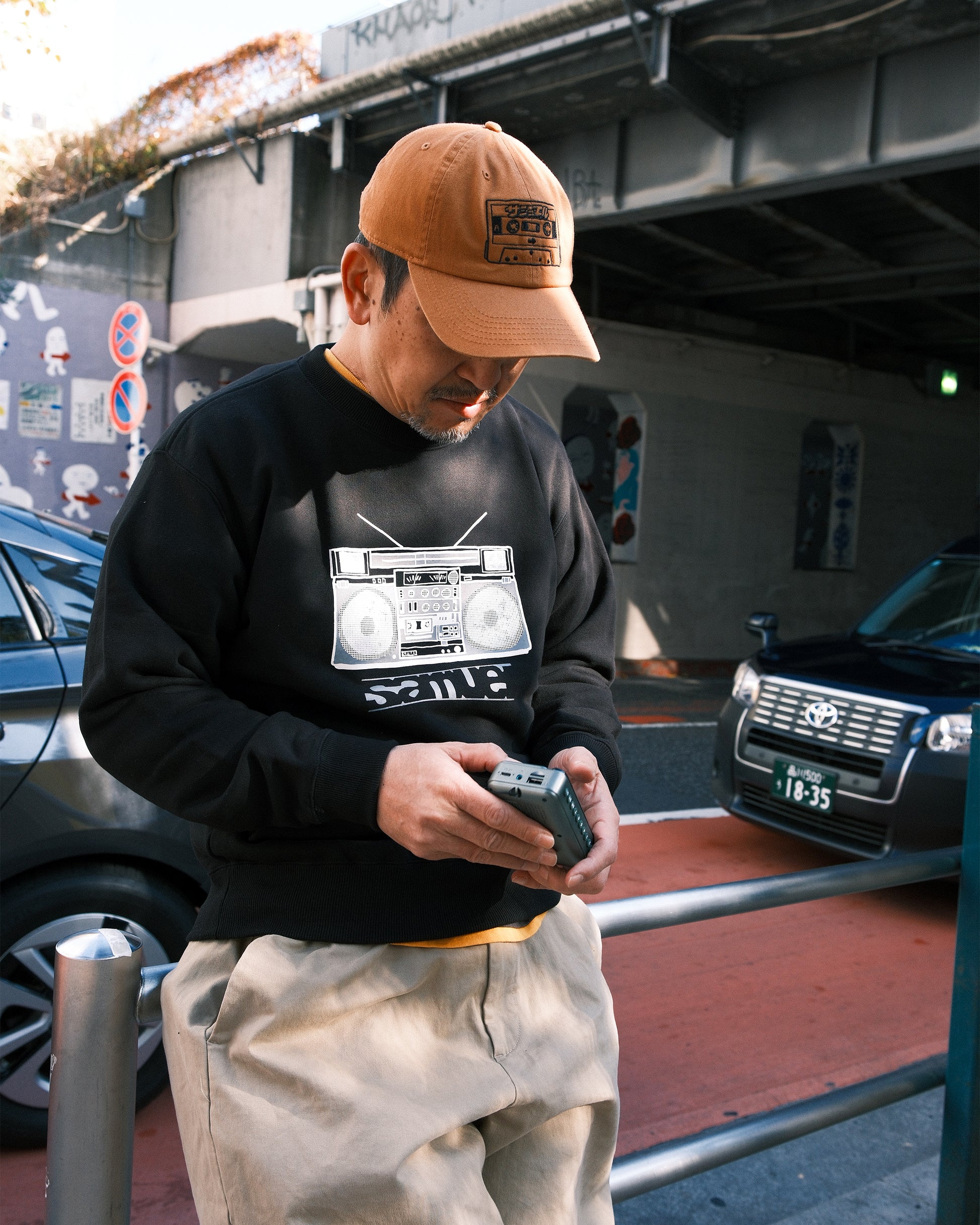 ANI手描きのオールドスクールなラジカセのプリント。オーセンティックなシルエットのクルーネックスウェット。